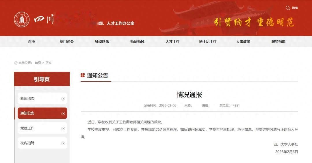 2月6日,四川大学人事处发布情况通报称,近日,学校收到关于王竹卿老师相关问题的反映。