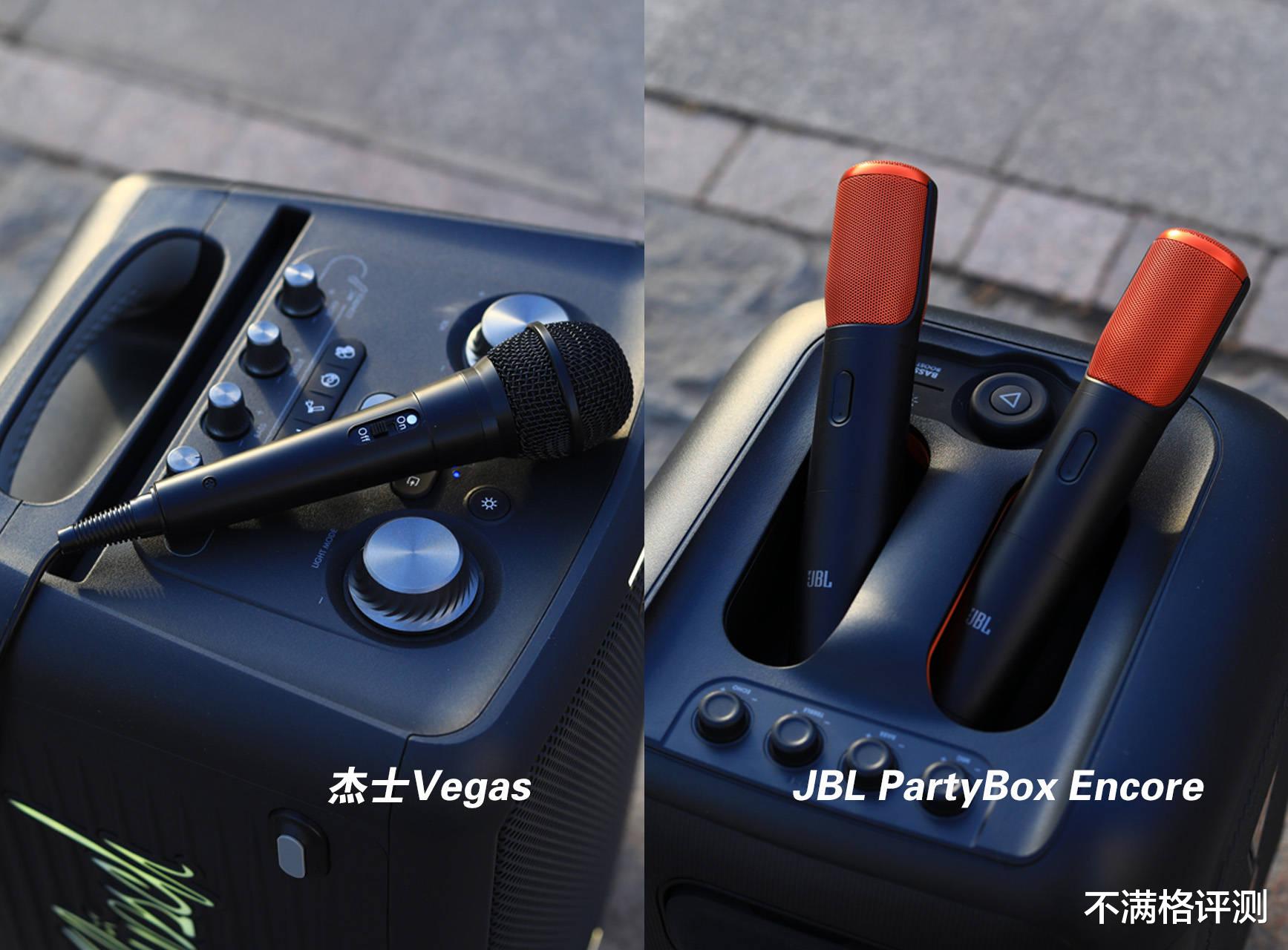 这种便携麦克风音箱其实主要就是用来听歌、唱歌的,户外、室内娱乐,调节气氛,或者用它直播赚钱等等。今天对比的杰士Vegas和JBL PartyBox Encore是我自留的两款高端音箱,整体来说它们都非常优秀,但对比起来也有一定的差别。杰士与JBL对比起来,一个更潮、一个经典,一个功能较多、一个功能较少,一个麦克风有线、一个麦克风无线,一个偏专业、一个偏家常。如果非要分出高低的话,我只能说更偏爱杰士Vegas一点。当然JBL也非常不错,两者可能就是95分和90分的差别。
