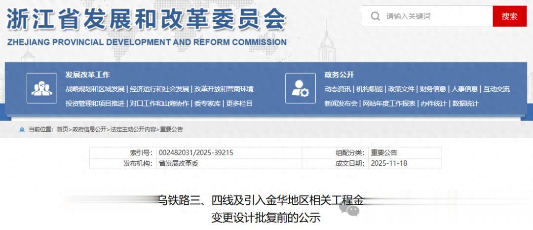 根据《省级政府投资项目初步设计重大变更管理工作指引(试行)》(浙发改办基综〔2024〕30号)文件规定,现对新建金华至义乌铁路三、四线及引入金华地区相关工程(金华铁路枢纽扩容改造工程)金义站站房及相关工程变更设计进行批复前公示,具体信息如下: