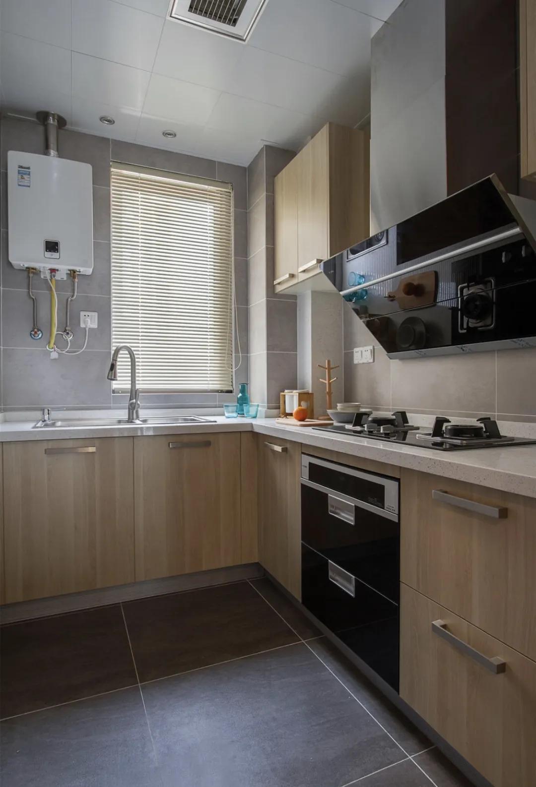 厨房做了定制的橱柜,U型的的橱柜收纳空间大,而且原木色的门柜更显得清新舒适,温馨,本身厨房的室内采光也非常好,所以一点都不用担心通风系统。