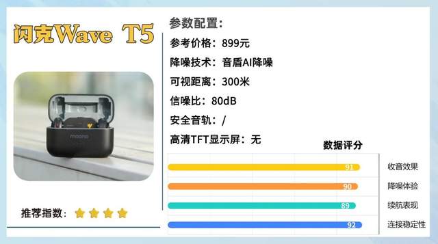 领夹/手持双模,高清收音,便携实用,降噪一般。闪克Wave T5机身轻便,可拆分为领夹麦/手持麦,一机多用,夹扣式佩戴牢固,手持握感舒适。搭载高保真全指向咪头,支持48kHz/24bit高清采样,人声细腻通透,立体声收音让画面更有空间感,适配口播、探店、剧情拍摄。2.4GHz传输无遮挡80米,信号稳定,开机即连,接收器即插即用,兼容手机、相机、电脑,支持两发一收。单设备续航12小时,充电盒总续航36小时,支持快充,户外可充电宝补能。短板是无主动降噪,强噪音环境收音效果打折,手持模式下风噪明显,无内置存储。适合全能型入门博主,用于Vlog、剧情短视频、小型访谈等。