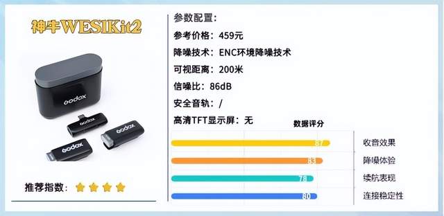 摄影生态适配,高速同步,收音稳定,便携性一般。神牛WES1Kit2发射器重30g,夹扣式佩戴,机身紧凑,适配神牛摄影灯等设备,可实现音影同步。全指向高保真收音,48kHz/24bit采样,人声细腻,基础降噪可过滤拍摄环境轻微杂音,适配影棚、户外轻量拍摄。2.4GHz传输无遮挡150米,抗干扰性出色,支持两发一收,实时耳返监听,兼容相机、手机,支持高速同步。单发射器续航9小时,充电盒总续航27小时,支持边充边用,影棚/户外两用。短板是机身略重,长时间佩戴有压感,便携性一般,强噪音环境无深度降噪,价格偏高。适合摄影爱好者、创作者,用于影棚拍摄、户外短视频、小型访谈等。