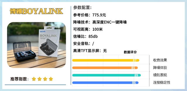 纽扣机身,极致迷你,AI降噪,续航偏短。博雅BOYALINK发射器如纽扣大小,重量仅5g,可贴肤佩戴,完全隐藏,适配各类穿搭出镜。搭载微型高灵敏咪头,支持48kHz/16bit采样,人声清晰,基础AI降噪可过滤室内底噪和户外轻微杂音,精准识别人声。2.4GHz迷你无线传输,无遮挡80米,抗干扰性适中,开机自动配对,接收器即插即用,兼容手机、相机。单发射器续航5小时,充电盒补能后总续航15小时,支持快充,便携性拉满。短板是续航偏短,不适合长时拍摄,强噪音环境降噪效果有限,无内置存储,仅支持单发一收,机身易丢失。适合颜值博主、轻量创作者,用于美妆Vlog、日常随拍、短时长直播等。
