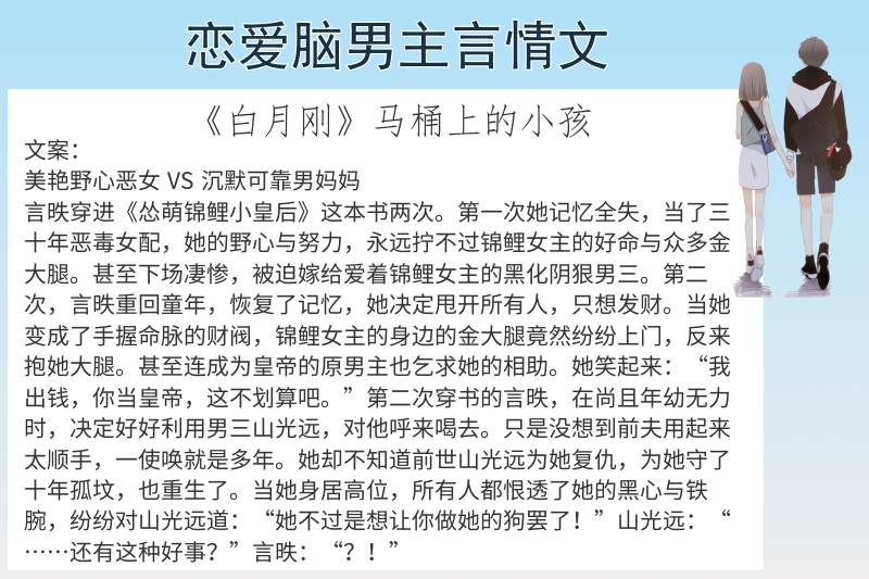 点评:这篇文这本书,画七还是埋梗大师让人有想看的欲望,这篇文从开到看完没有一点感受到怠力的地方,就是想看完看完哈哈哈哈哈哈以及这个作者真的是个取名废,好好一篇文非叫这个三流狗血文名,我真的差点因为书名错过了这本书,书名过于晋江风格了。这本书推荐至少能在四星以上,不为别的,作者格局很大,不拘泥小情小爱,文笔也是流畅的,剧情也是舒适的,没有什么明显不符合人物逻辑的地方,是值得看二遍的书。