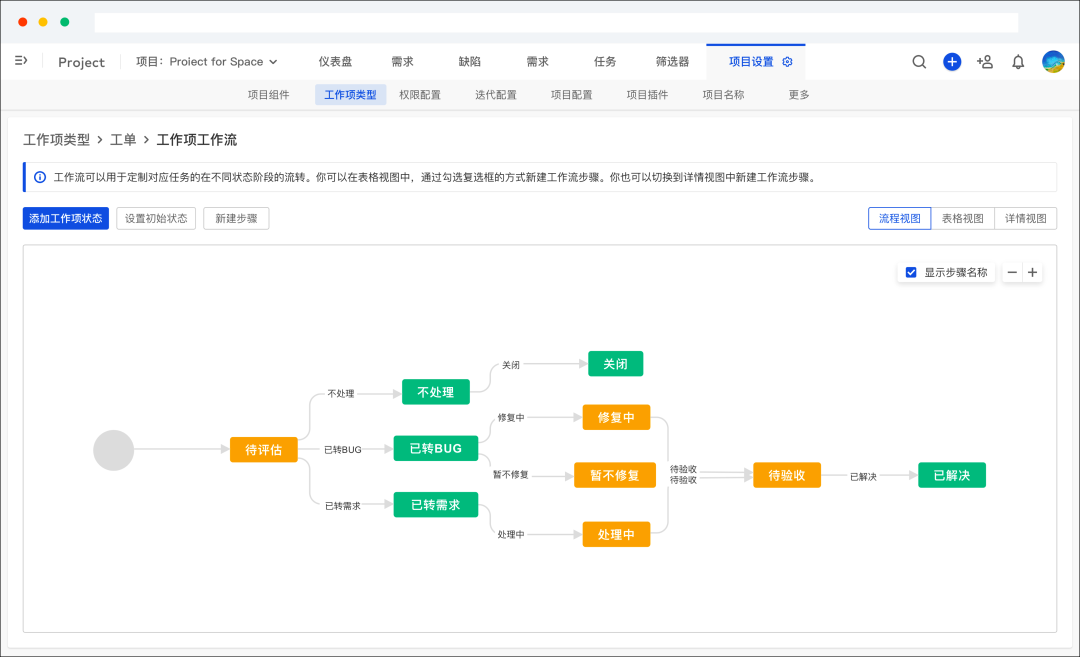 需求状态从“草稿 → 待评审 → 通过 / 驳回”,对应不同角色的操作权限;