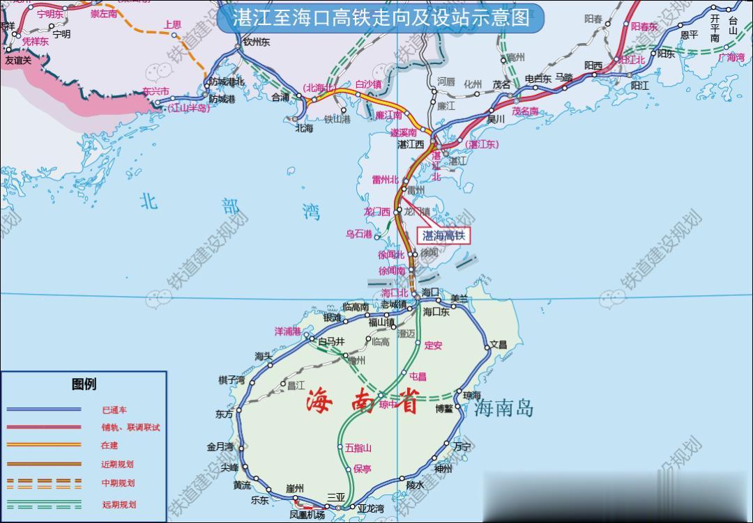 湛海高铁是国家“八纵八横”高速铁路网包(银)海通道的组成部分。线路起自在建广湛高铁湛江北站,向南经湛江雷州市、徐闻县后通过轮渡跨越琼州海峡至海口,接入海口站联通海南环岛高铁。