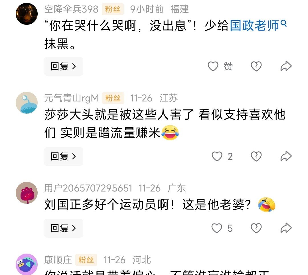网友们的评论更是犀利:"莎莎大头就是被这些人害了,看似支持喜欢他们,实则是蹭流量赚米。"这话虽然刺耳,但细想之下,不无道理。在这个流量至上的时代,谁又能保证自己不是为了关注度呢?