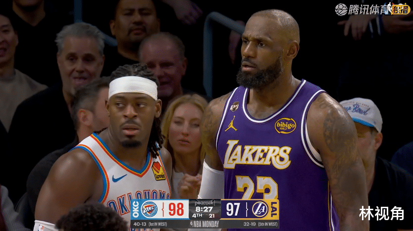 老詹三分打铁,杰伦威造杀伤两罚两中,一点不手软,分差来到7分,湖人命悬一线。