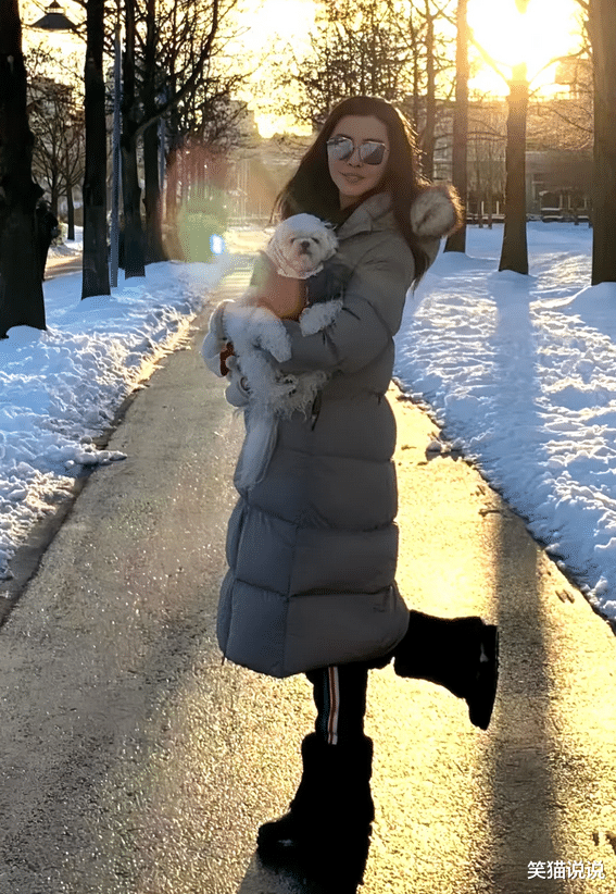 王祖贤站在路上,她将爱犬智悟抱在怀里,对着镜头翘起单脚,对着镜头露出了惬意的笑容。路的两边的皑皑白雪,而她的背后是温暖的落日和树木,这画面看起来十分温暖,也很有诗意。