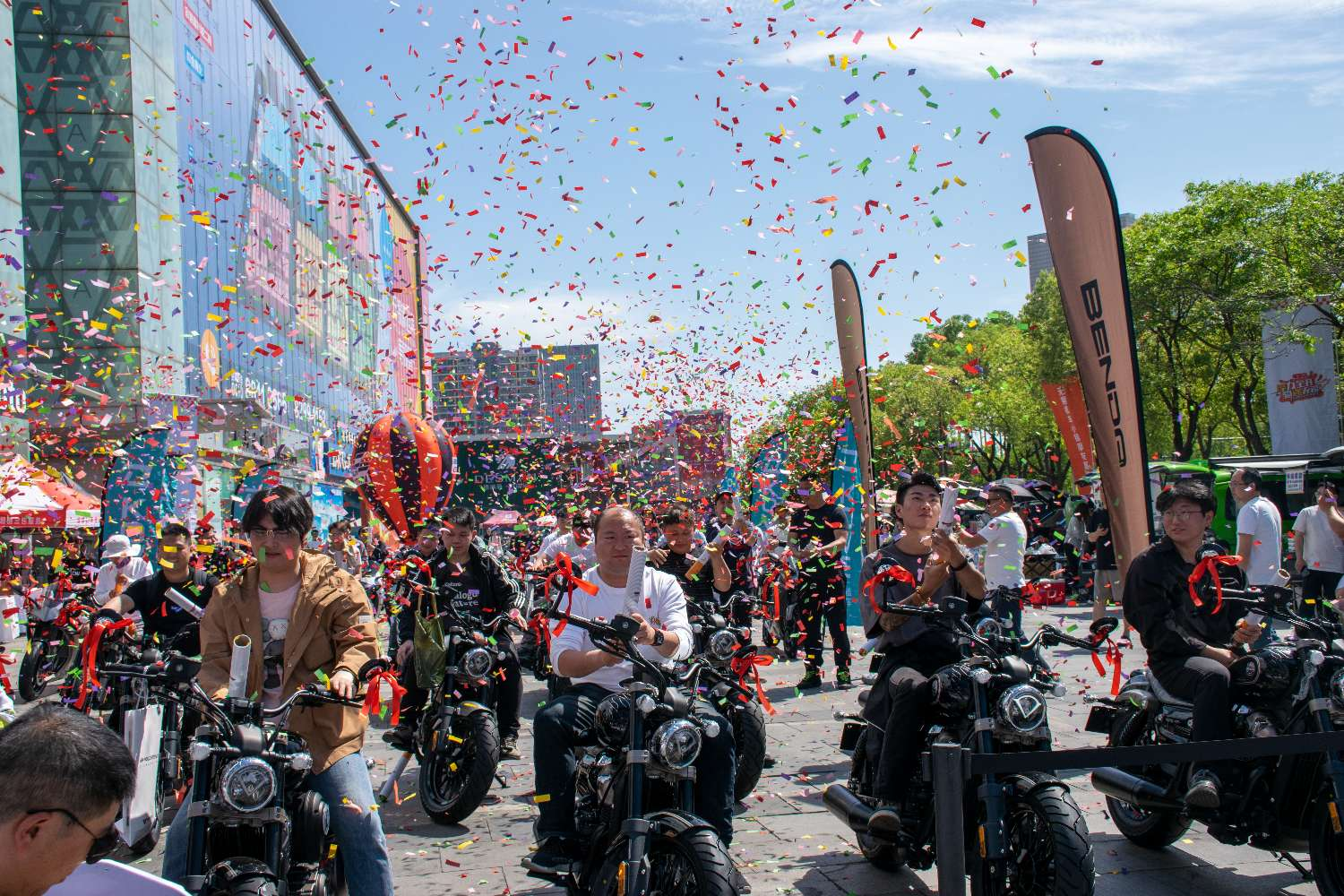 “3、2、1……”在数千名嘉宾的倒计时呐喊声中,80多名新车车主点火发车。一时间,引擎轰鸣,欢呼呐喊,彩带飞舞,低音重炮,共同交织成一片欢乐的海洋,由春风、本田、豪爵、凯越等品牌机车新车车主组成的车队整齐列队,接受着现场车友们的祝福与喝彩,锃光瓦亮的车身、霸气十足的队形,瞬间点燃所有骑士的热血 DNA。