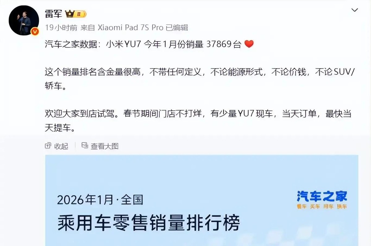 真正把讨论推高的,其实是“无定语登顶”。雷军回应 YU7 在 2026 年 1 月拿下中国乘用车全品类销量第一,这个说法没有细分、不限能源、不玩区间。放在当下的汽车市场,这种表达本身就很少见。大家平时看到的,多半是“某价位”“某细分”“某类型第一”,看久了难免麻木。现在突然来一个不加修饰的第一,很多人的第一反应不是庆祝,而是反复确认数据来源。这就像成绩单上突然出现一个全校第一,周围人一定会多看两眼。