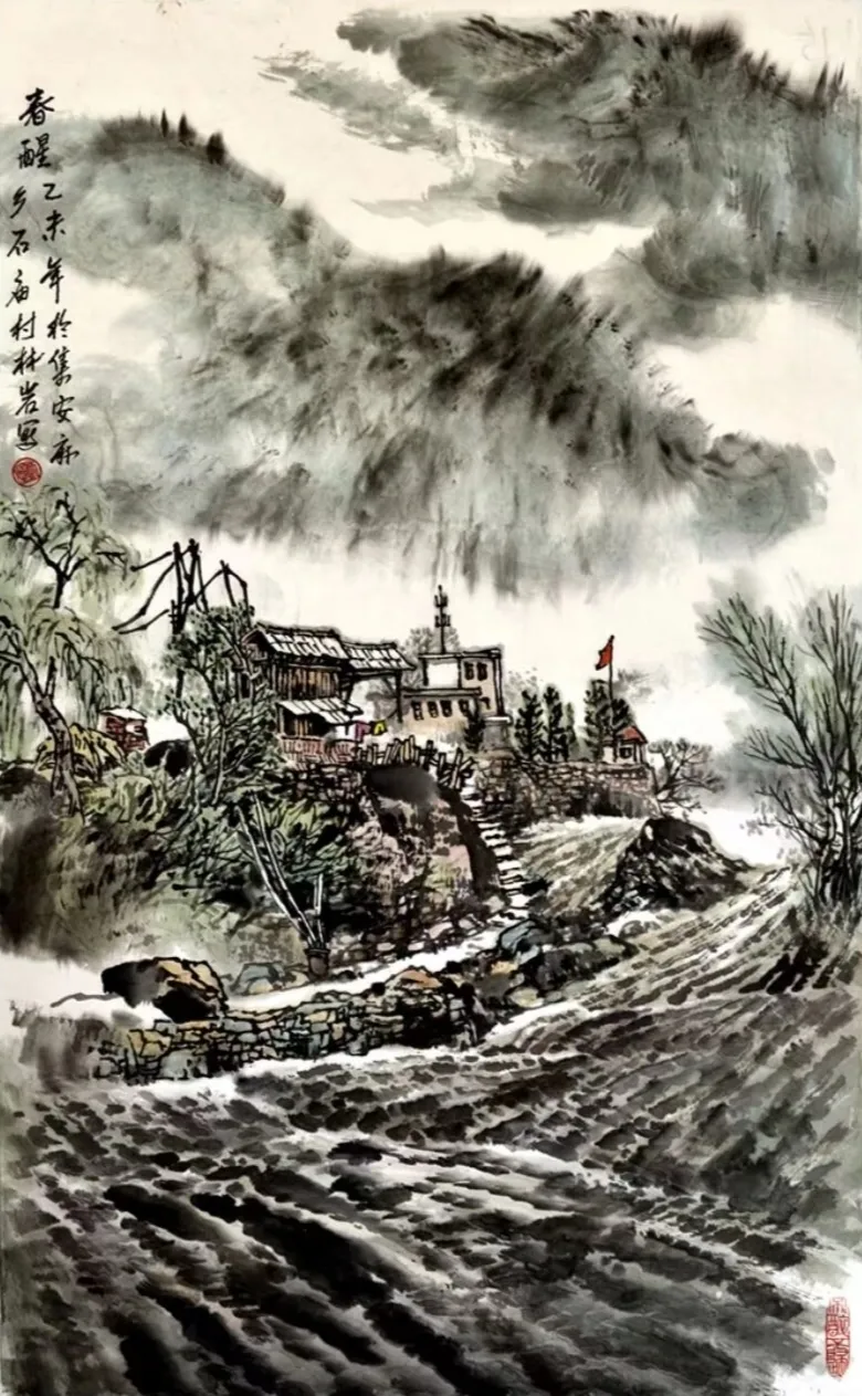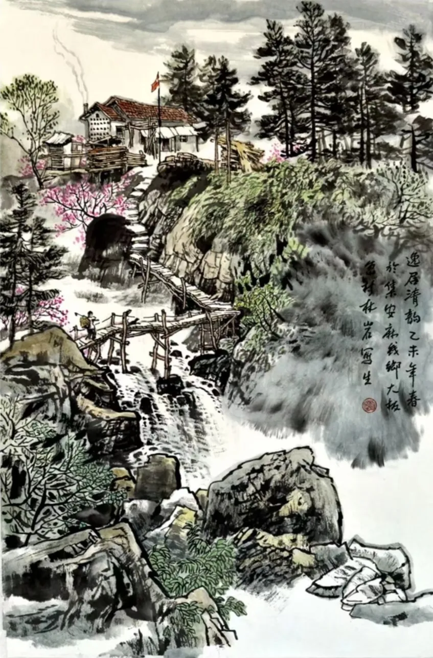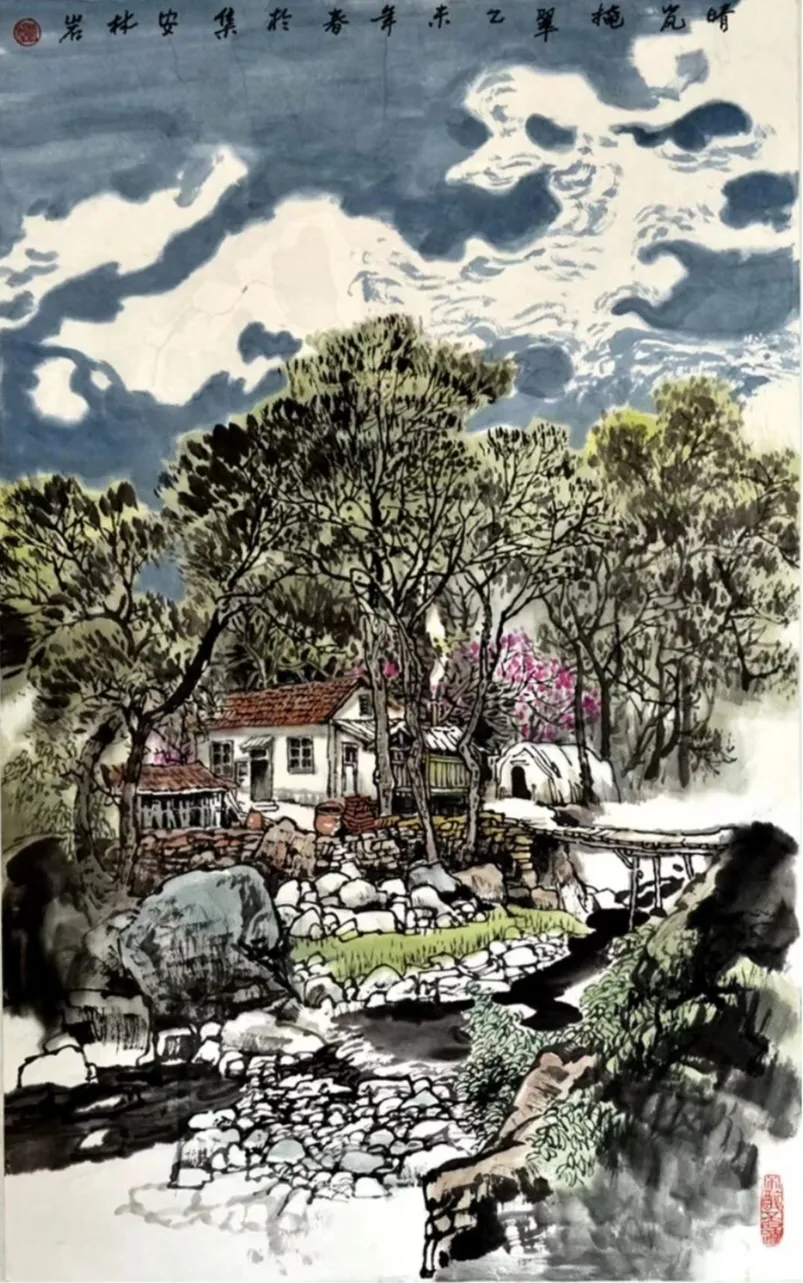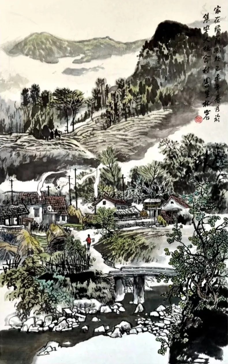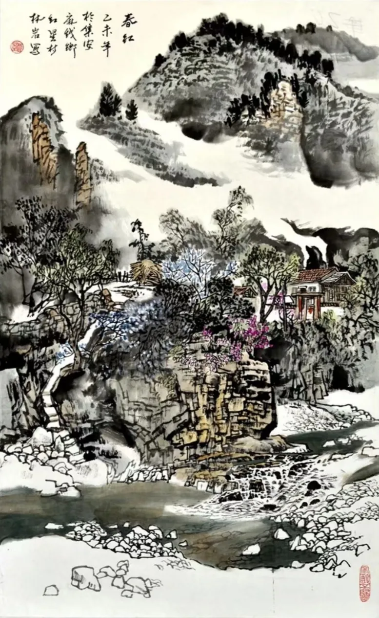 其画作以浓淡墨色构筑出山川的坚实骨相与氤氲气韵,又巧妙点缀以淡彩,于厚重中透出生机。通过“以形写神”的手法,石屋、木桥、溪流等寻常景致被赋予深远的人文情致,传递出对乡土深沉的眷恋。林岩先生深厚的学养与多元的创作实践,使其艺术在传承中展现出鲜明的当代感知,形成了雄浑而秀润、写实而抒情的独特风格,在学术与收藏领域皆具重要价值。