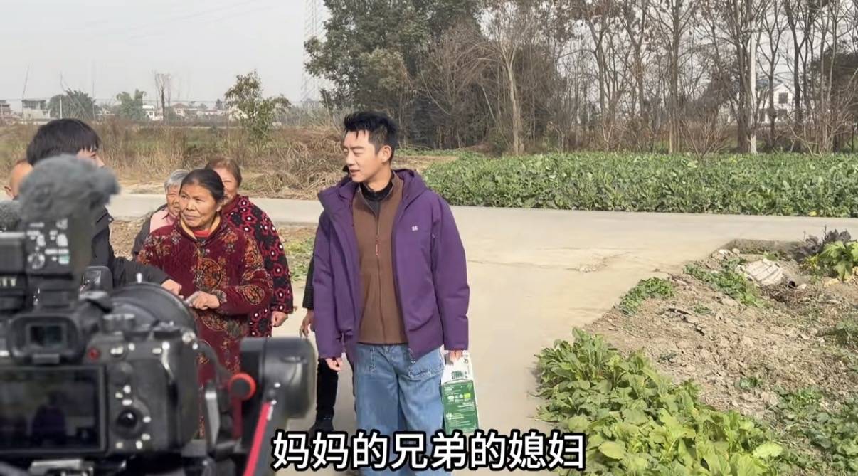 郑恺一大早就来了,村民们开着拖拉机去镇上接他。郑恺穿了一件紫色连帽外套、内搭是棕色毛衣,配了牛仔裤,清爽利落显得很年轻。