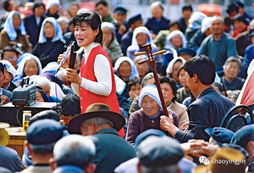 例如2000年4月6日下午,我去丰县开会在酒店楼上眺望街景时,忽见有上千人围坐在凤城广场,观赏套楼乡大王村评书歌唱演员黄小玲夫妇为当地父老乡亲义演,许多观众为遮避骄阳,青一色的头顶蓝白相间的毛巾,面向身穿红马夹伫立广场中心的乡村艺人,如众星捧月,场面非常壮观。