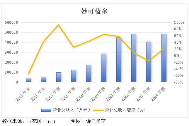 然而,现实却不尽人意。蒙牛入主后,妙可蓝多业绩增长乏力,其中营收增速2021年就开始下滑,2023年甚至出现负增长。2024年虽然回正,但营收仅跟2022年持平。
