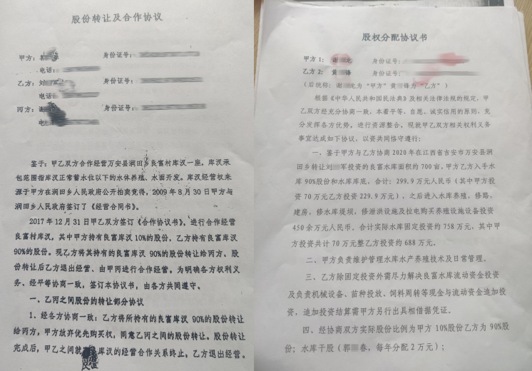 2009年8月30日,万安县涧田乡相关部门与郭某春签订《经营合同书》,郭某春获某富库汊30年承包经营权(至2036年)。2020年12月27日,郭某春、刘某军与谢某龙签订《股份转让及合作协议》,刘某军将90%股权经营权转让给谢某龙,郭某春保留10%股份。随后,谢某龙与黄某锋签订股权分配协议,黄某锋作为主要投资人占股90%,谢某龙负责日常管理占股10%;据当事人称,二人合计投入超1350万元(股权受让299.9万元+设施建设及养殖投入450余万元+运营资金600万),库汊年均产值超800万元,年利润过百万,经营态势良好。
