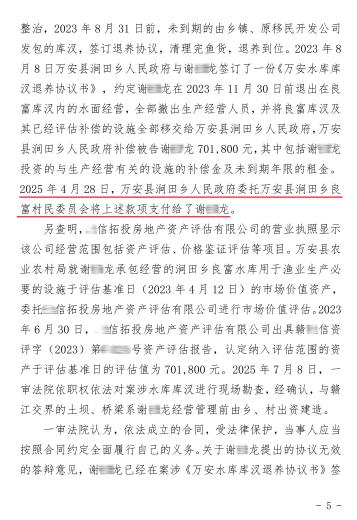 8月8日,谢某龙与涧田乡相关部门签订《万安水库库汊退养协议书》,约定谢某龙于11月30日前移交库汊及设施,乡相关部门支付补偿款701800元。