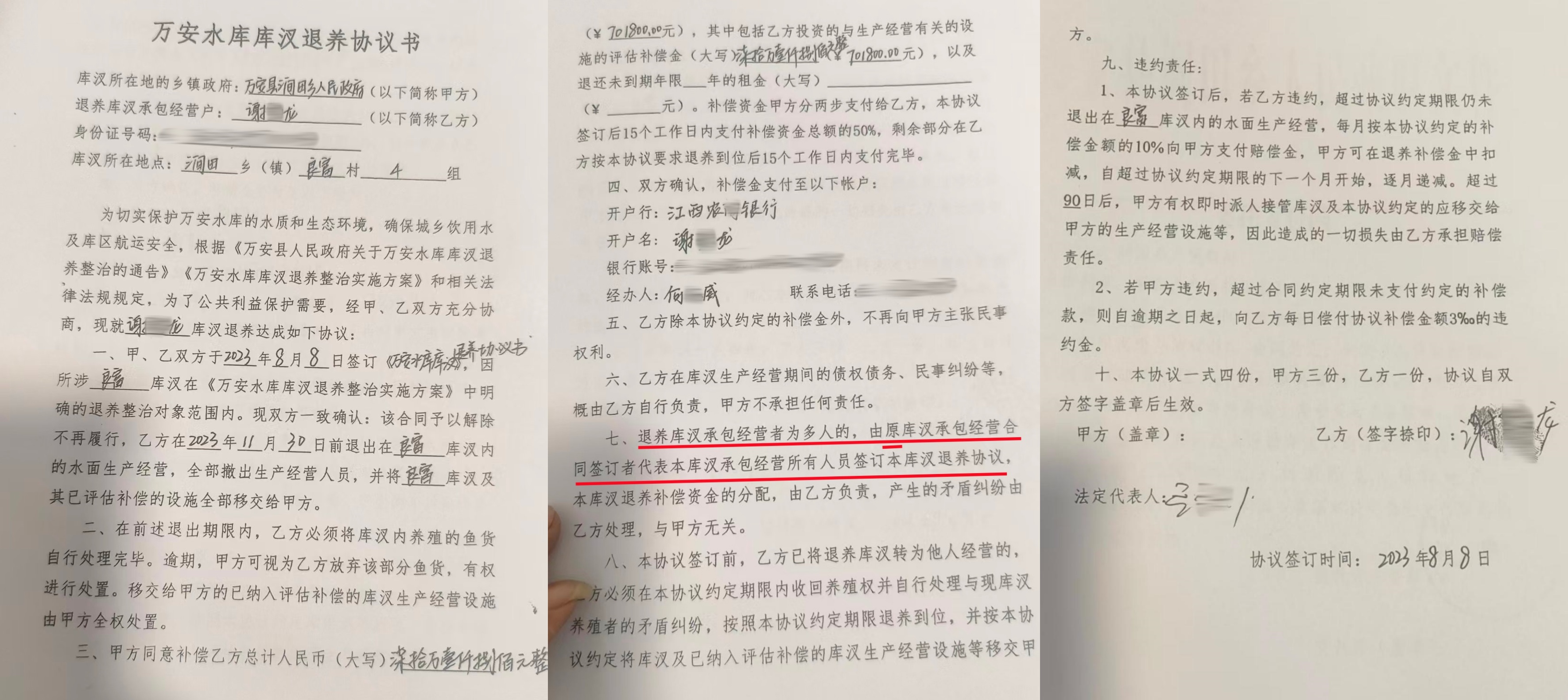 更值得注意的是,当事人称退养协议签订前后,其养殖经营屡受阻碍:有相关乡镇干部现场干扰养殖、阻拦鱼中介拉鱼,通行道路也被阻断,致成鱼无法外销、养殖密度过载,几十万斤成鱼死亡。谢某龙是迫于经营困境才签协议,且当时协议未填补偿金额,也未按常规在金额处按手印,签署时无盖章痕迹,当事人合理质疑协议存在页面置换、内容更改的情况。