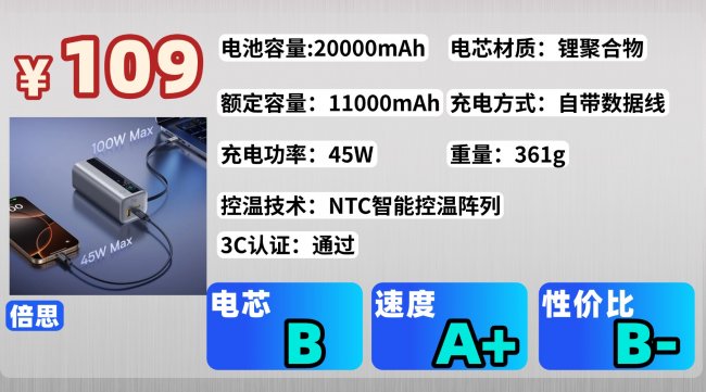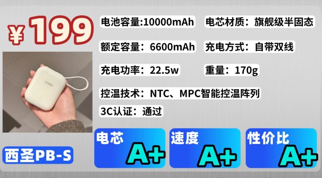 许多低价充电宝采用劣质电芯,导致续航差,电池损耗快。劣质电芯不仅充电时效率低,甚至可能导致过热或电池膨胀等安全隐患。如果充电宝的电芯设计不佳,使用一段时间后电池性能会显著下降,甚至无法承受高负荷使用。一:2026年排名前十充电宝清单教你选对那真正靠谱、性价比高的充电宝该怎么选?2026 年有哪些品牌是把成本花在安全和耐用上,而不是花里胡哨的功能上?这篇我结合实测体验和口碑,给大家盘点几综合表现在线的充电宝,帮你避开虚标、劣质电芯这些坑,直接选到快充稳、够安全、长期用不翻车的放心款。第1款:西圣PBS半固态充电宝西圣PB-S,这一款充电宝不仅体积小,它在电池上采用的是半固态电芯,安全性也很高,而且这段时间用下来,真的觉得是百元价位中性价比最高的一款充电宝了!