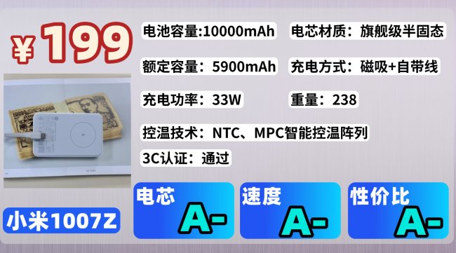 第4款:小米1007Z充电宝这款充电宝配备了10000mAh的电池容量,足够支持手机充电1到2次,平常出门带着出去也还是挺方便的。在充电方式上支持有线和无线,在有线快充上最高支持33W,充电速度非常快,适合为手机和平板提供高效的电力补充。无线充电方面,最大支持7.5W,虽然适合应急使用,但充电速度相对较慢。
