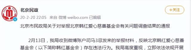 信源:北京民政 20-2-20 22:05 微博 北京市民政局关于对举报北京韩红爱心慈善基金会有关问题调查结果的通报