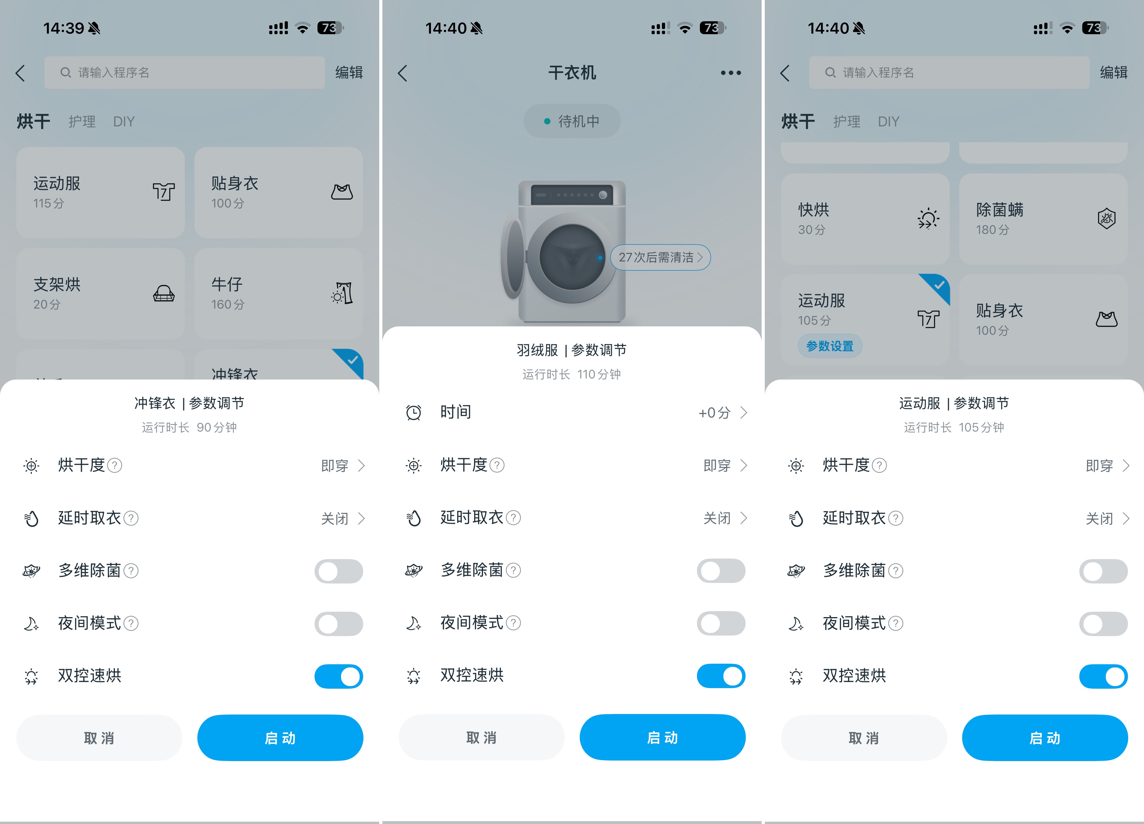 🔽 打开“双控速烘”后,烘干用时相比普通机器明显要更短。