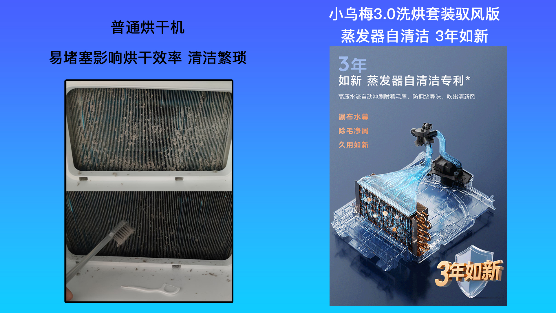 小乌梅3.0洗烘套装驭风版搭载了自有专利的蒸发器自清洁功能,这也是万元机器才会有的配置。机器会自主使用瀑布水流冲洗蒸发器,用久了也和新的一样。
