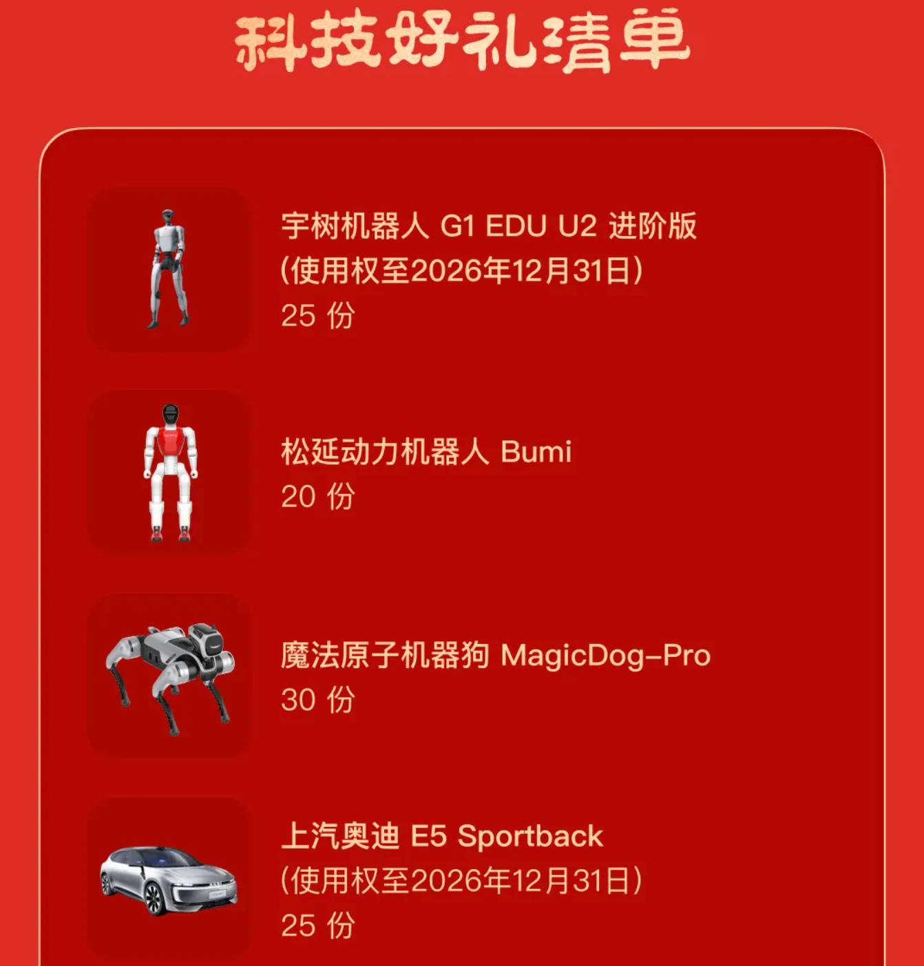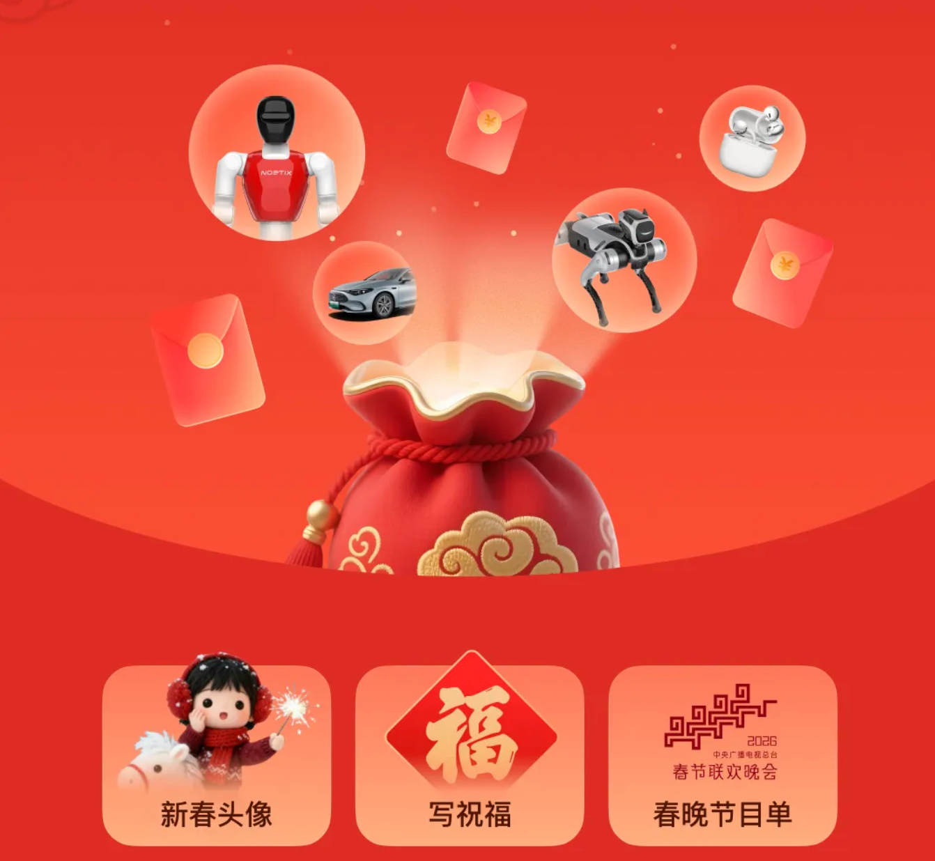 此次豆包除夕抽取的奖品凸显科技属性,包含宇树机器人、奔驰纯电CLA、大疆无人机Neo 2畅飞套装等科技好礼;现金红包金额随机,最高8888元。