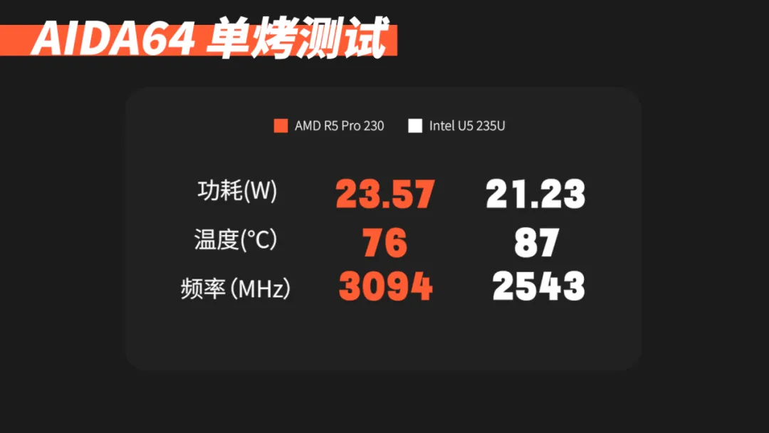 AIDA64压力测试显示,AMD在23.6W功耗下温度为76℃,频率维持3.1GHz;Intel在21.2W时温度已升至87℃,频率降至2.5GHz。