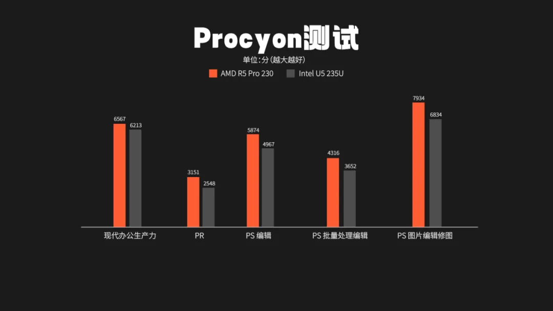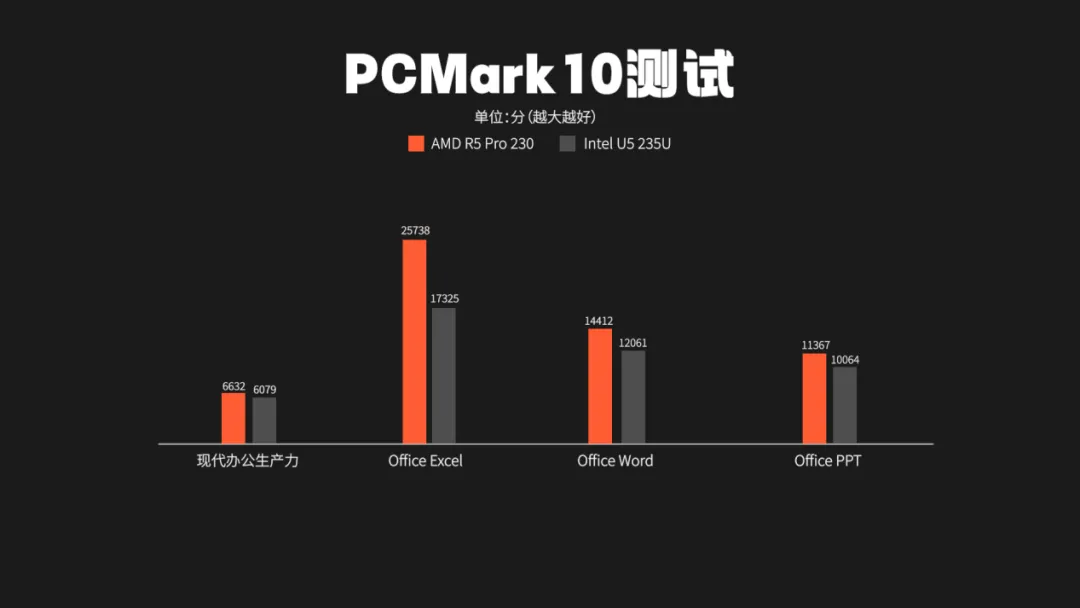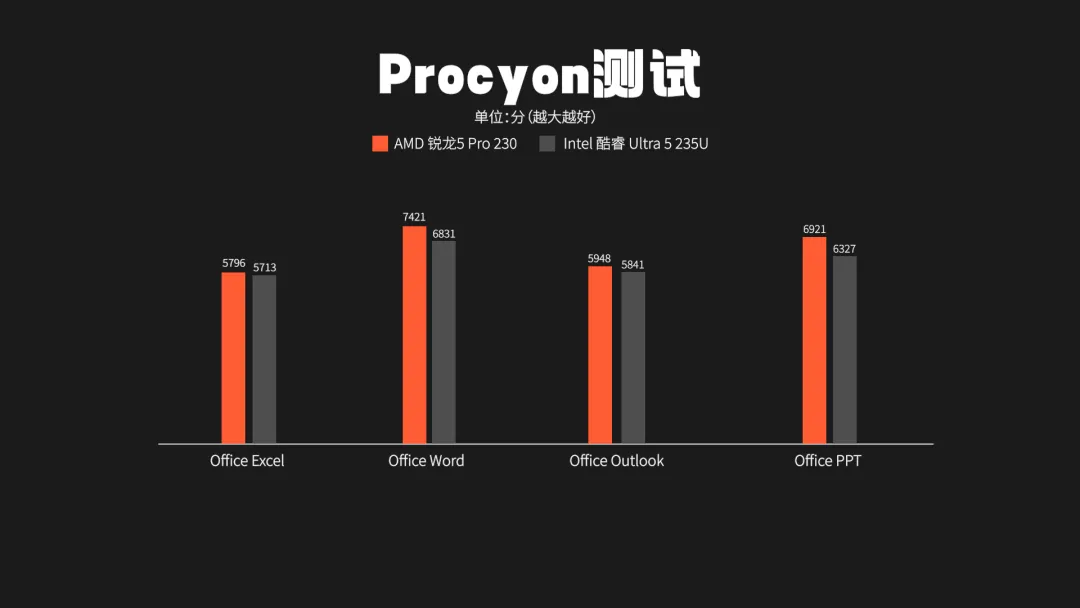 在PCMark10与Procyon办公场景模拟中,AMD的表现极为亮眼,各项成绩都有不小的领先。这些差距,在数据上看似几十个点,在体验上却是完全不同的使用节奏。没有频繁的加载中,没有那种会议现场切PPT时的微卡顿才是生产力设备的根本意义。