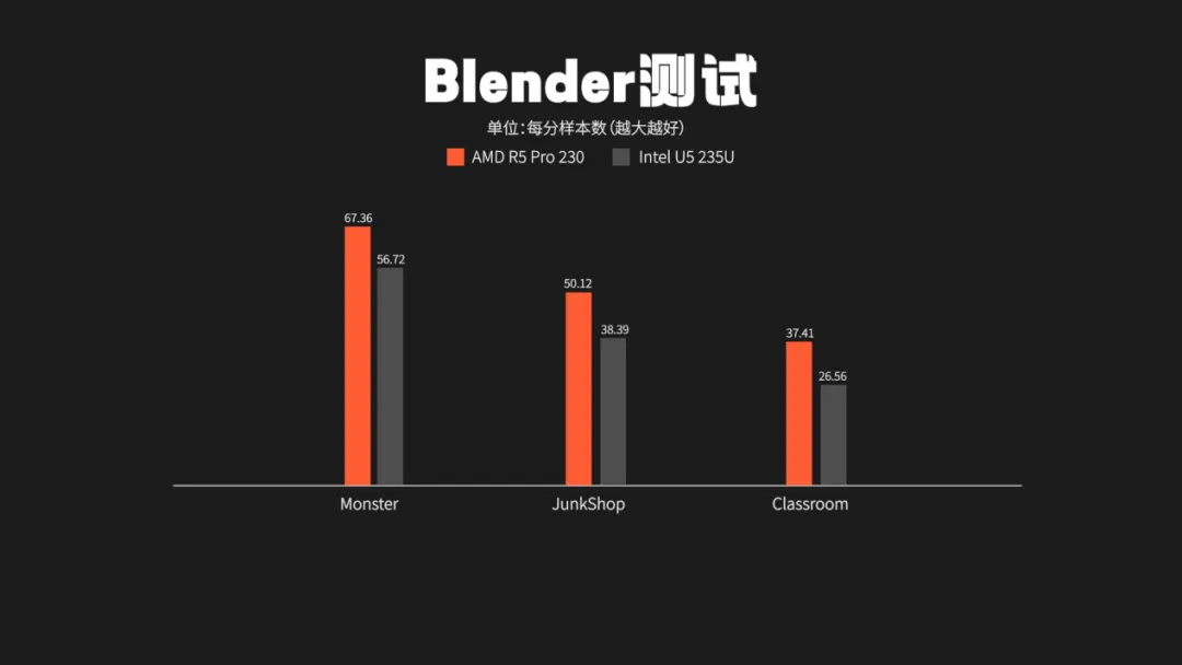 在Blender渲染测试中,AMD仍保有一定优势,三个场景下的渲染速度均高于Intel。但需要注意的是,虽然这种差距主要出现在纯渲染场景中,但在更复杂的内容创作流程中——例如边预览边导出、边渲染边调整素材的混合负载下,AMD的表现也仍会更为平衡。