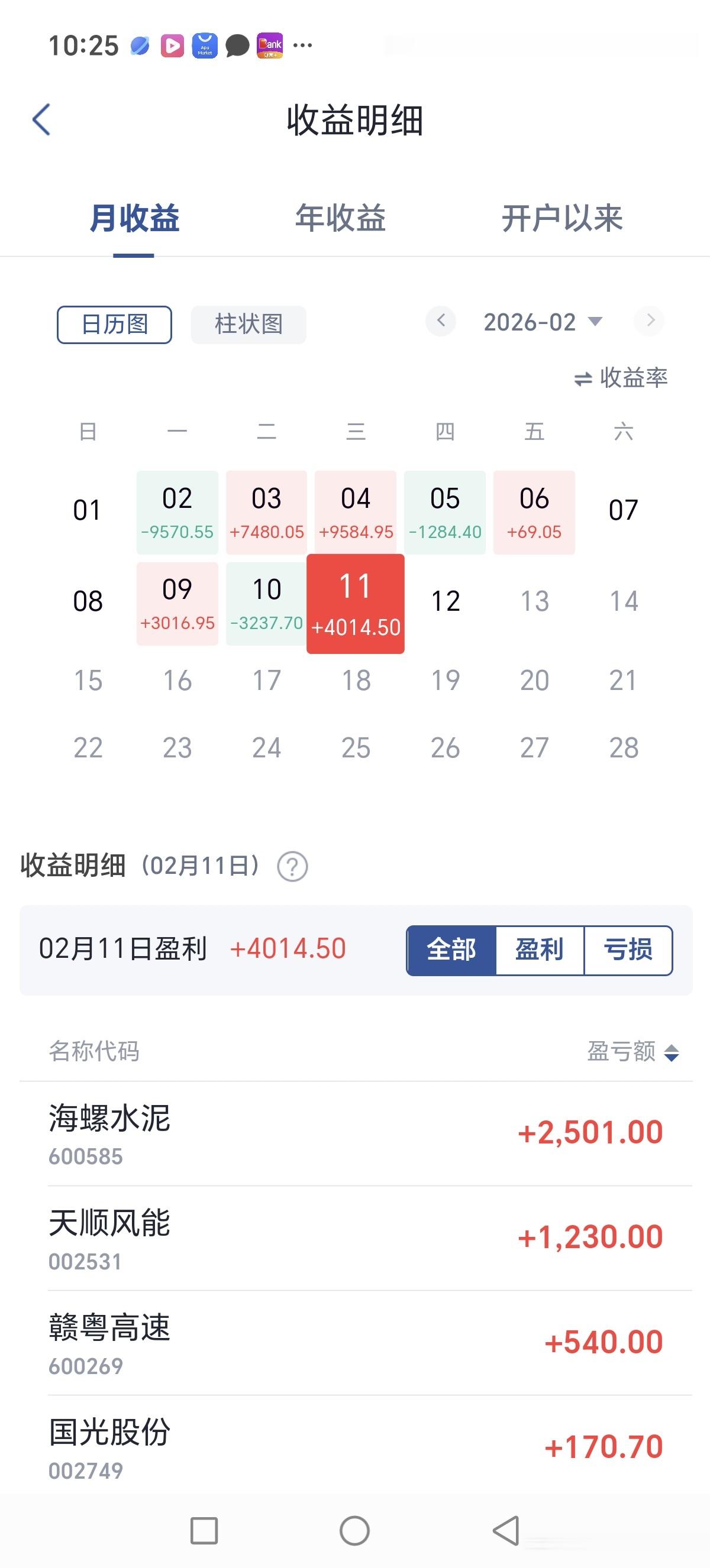 这是我今年自一月一日开始的战绩,我今年的目标:年收入12万元。股市上不能按日,月计算,不卖出去永远不是自己的利润。每天起起伏伏,下面的是这个月的每天收益情况,如果没有特殊情况,我每天来更新一次。