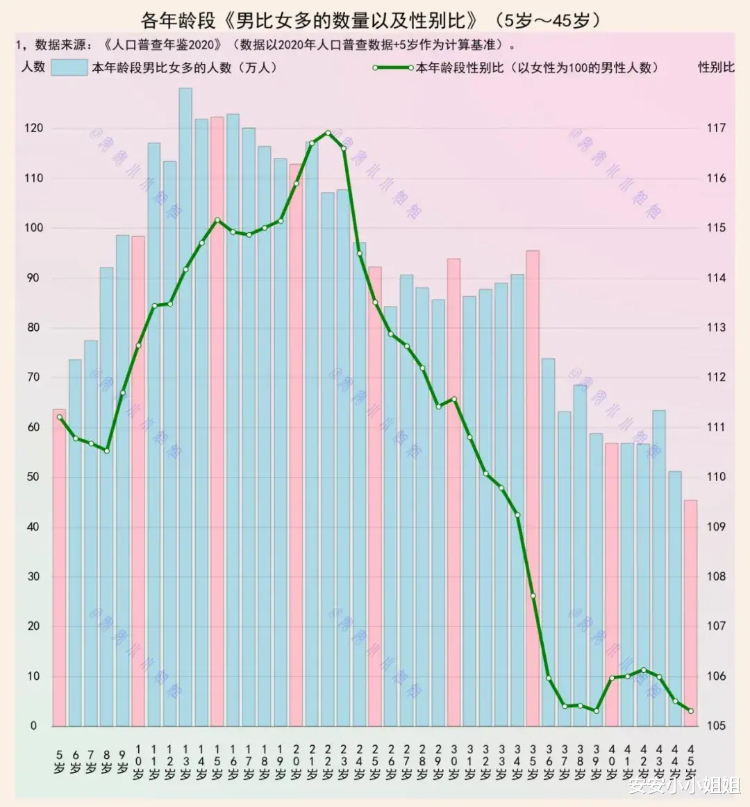 五岁的孩童,尚不知婚姻为何物,性别比却已悄然抬头。待到十一岁,那蓝色的柱子便陡然一耸,男比女多出百万人。