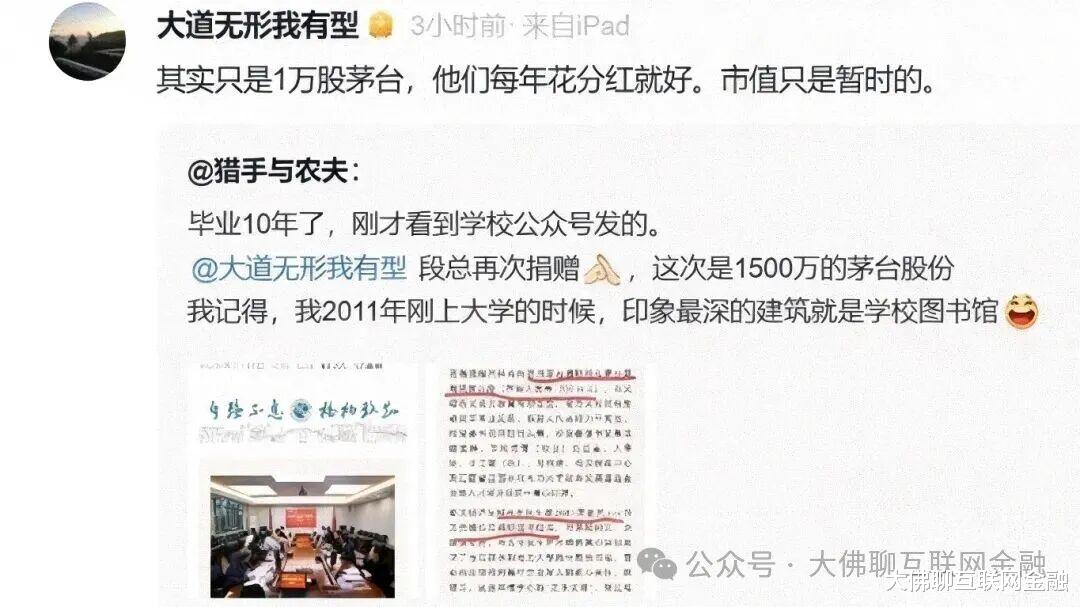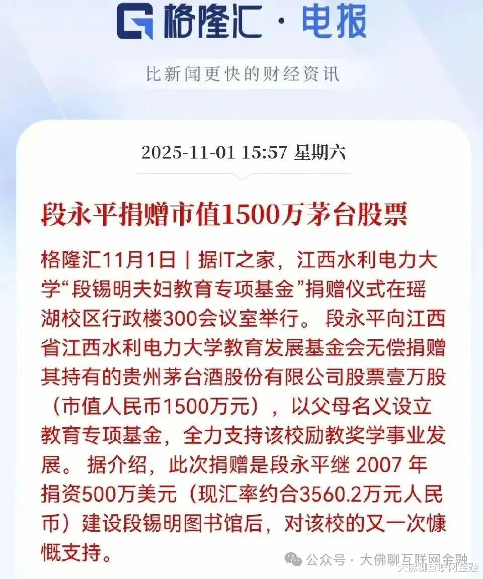 10月31日,某高校举行了一场捐赠仪式,段永平向该校教育发展基金会捐赠了1万股茅台,按当时的市价算,价值大概在1500万元。