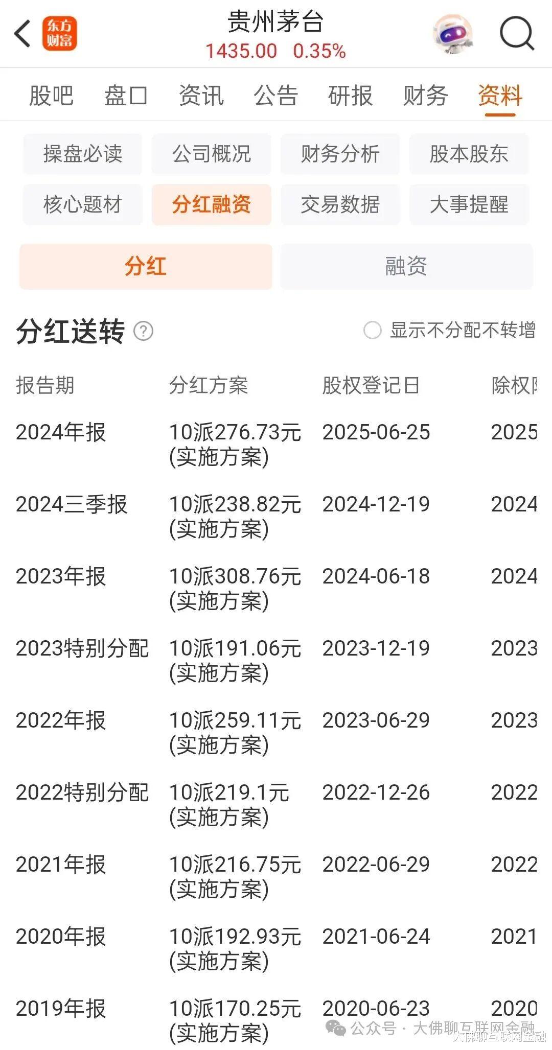 就比如去年,茅子总共实施了两次分红,全年预计分红达647亿。