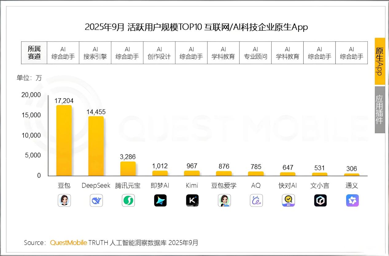 字节跳动旗下的豆包在用户规模上表现出色,稳居行业榜首。字节跳动凭借抖音、今日头条等超级 App 的巨大流量入口,为豆包带来了源源不断的用户。