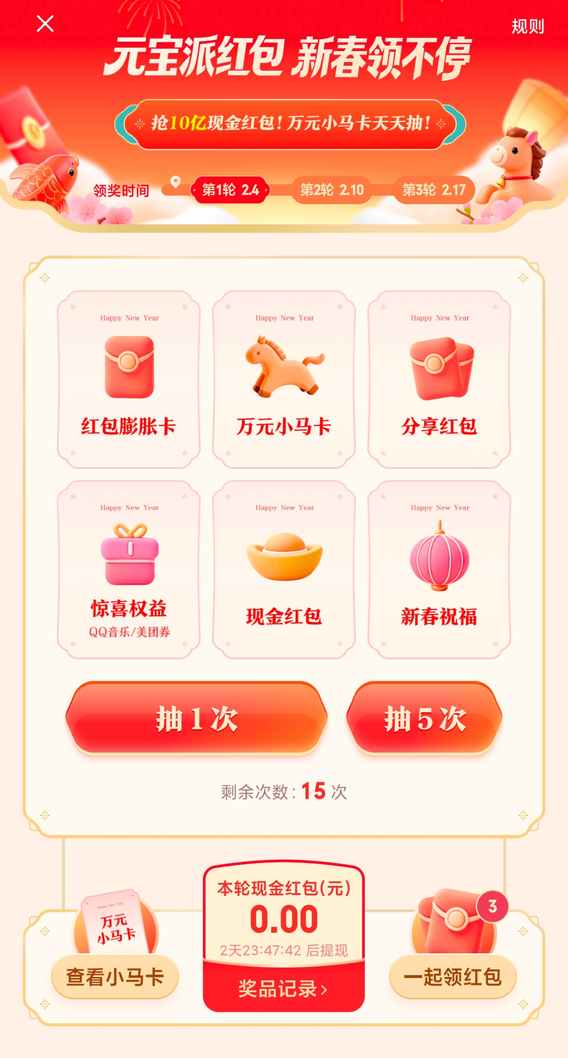 活动设置了丰富多样的红包形态,除了常规的现金红包,还有万元小马卡和分享红包。用户每天登录元宝 App 都能领取现金红包,通过完成任务还可抽更多红包,并有机会抽中限量 100 张、价值 1 万元的现金小马卡。分享红包支持转发给微信、QQ 好友和社群,实现了 “元宝出钱、好友拆红包” 的社交裂变玩法。