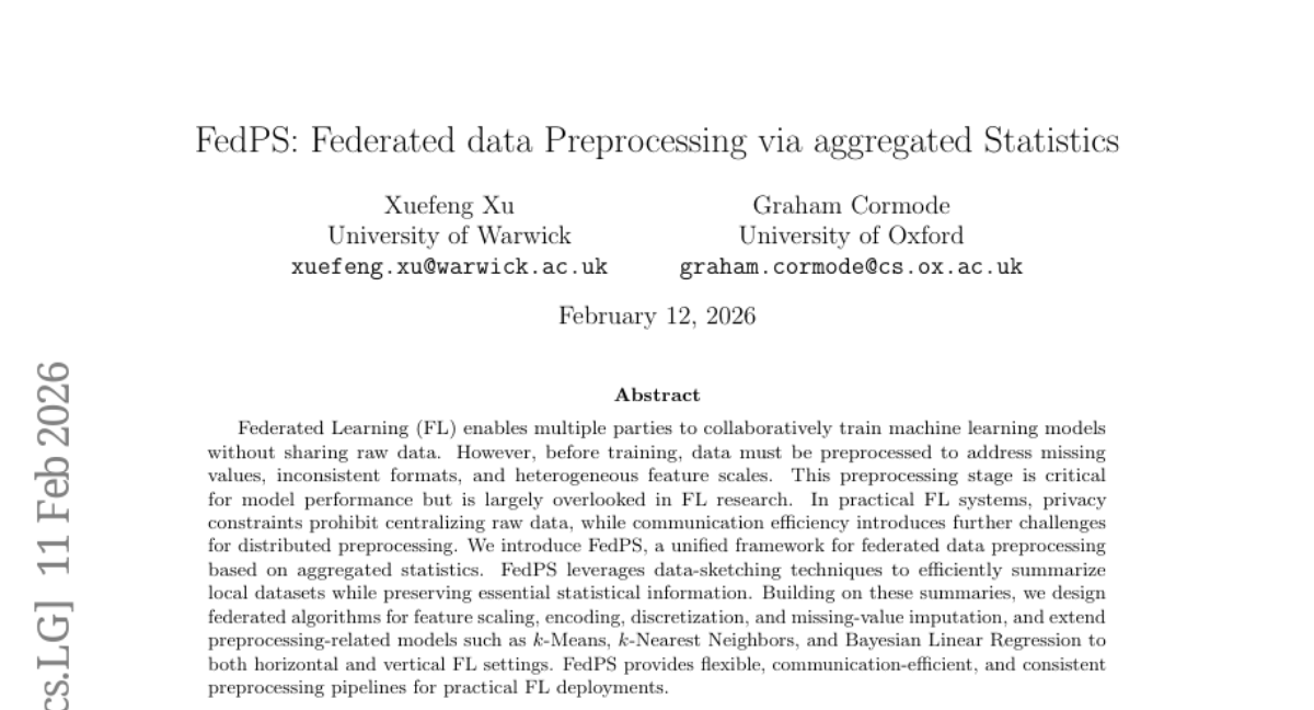 A:FedPS是华威大学和牛津大学联合开发的联邦数据预处理框架。它解决了联邦学习中一个长期被忽视的关键问题:如何在不共享原始数据的前提下,让分散在不同地方的数据获得统一标准的预处理。就像让分布在各地的厨师按照统一标准处理食材,确保最终合作出来的菜品口味一致。