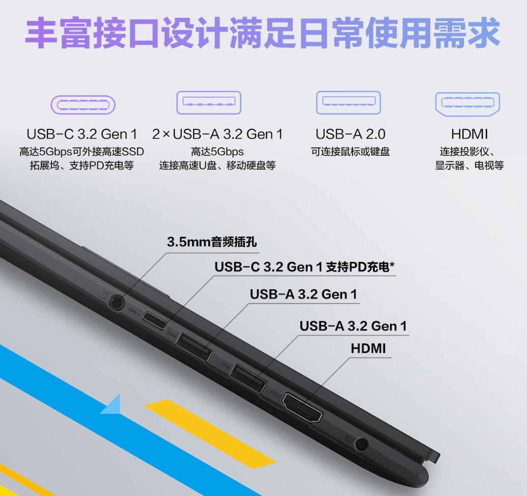 接口够丰富:3个USB-A+USB-C,不用带扩展坞