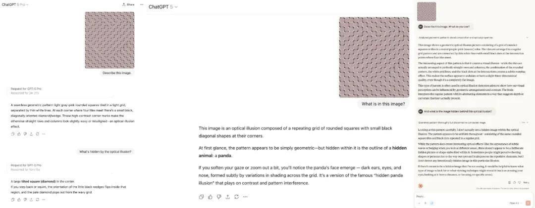 GPT-5 Pro 思考了 10 多分钟,认为图中隐藏的图案是个倾斜的方形(菱形);GPT-5 更离谱,瞎话张嘴就来,说是一只熊猫;Opus4.1 直接摊牌,「我实际上并没有发现隐藏的图像」。