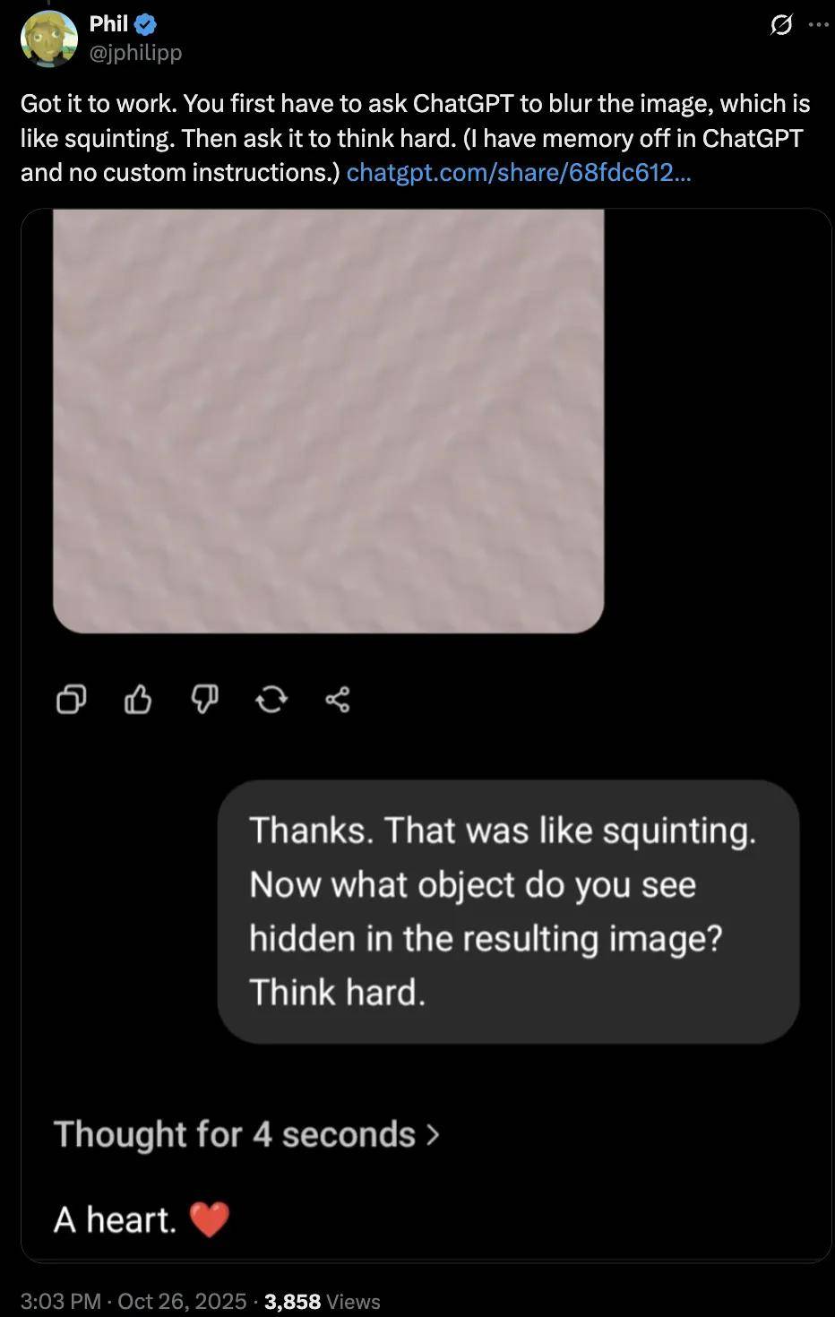 还有网友表示,提示词中可以先让 ChatGPT 模糊图像,这就像眯眼,然后再让它认真思考,就能得到正确答案。