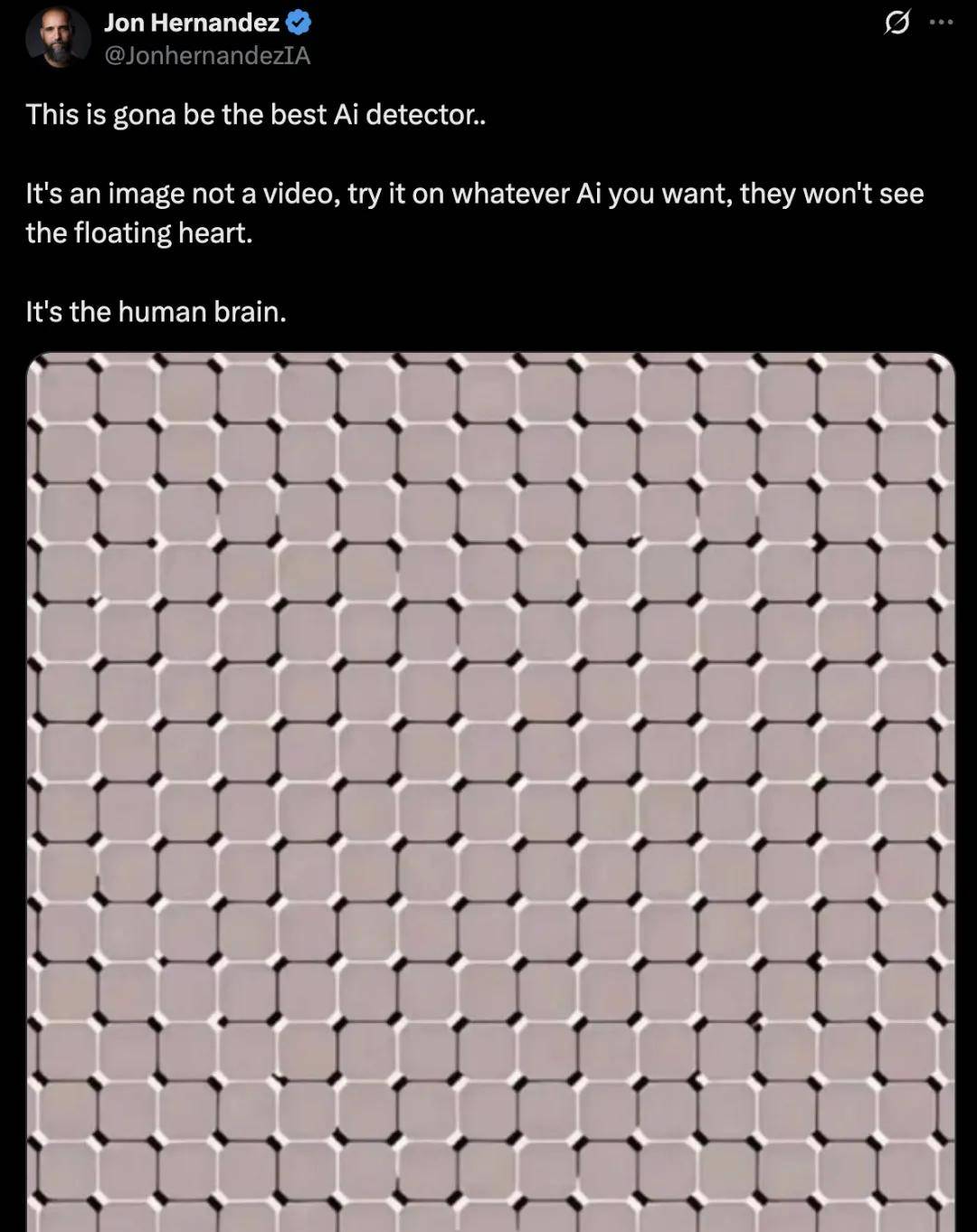 X 博主 @JonhernandezIA 认为这种光学错觉可以成为一个「AI 检测器」,因为人类大脑的生物特性(容易受到错觉影响)与 AI 的计算特性(依赖数据和算法)存在显著差异。