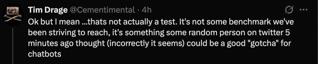 「这并不是一个真正意义上的测试或基准,也不是 AI 研究社区长期努力追求的目标。这只是某个 Twitter 上的随机用户几分钟前突发奇想,认为这可以成为一个捉弄聊天机器人的好方法。」