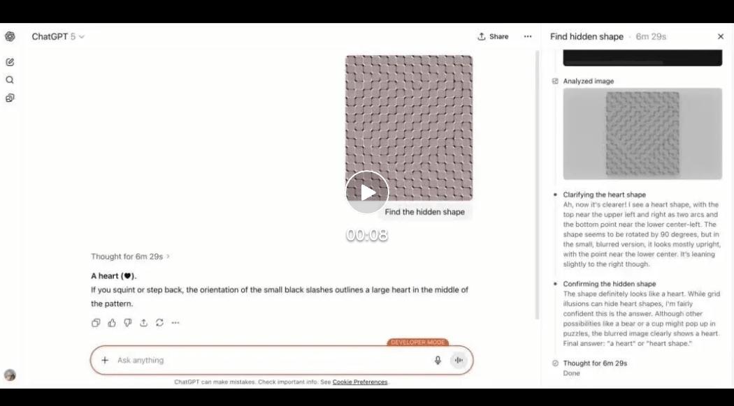 网友 @EdDiberd 在稍晚时间使用 GPT-5 Pro,没有依赖模型的定制功能或者记忆功能,直接上传图片并输入提示词:Find the hidden shape,这次 GPT-5 Pro 给出了正确答案。