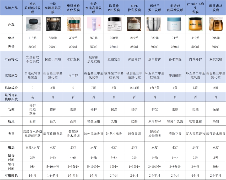 不想一个个试发膜踩雷?看完上面的选购技巧,是不是想直接看真实效果?我把几款热门发膜的实测核心表现整理成表格,涵盖使用感受和效果。希望这些真实体会能帮你快速选到合适的,省点时间和钱~