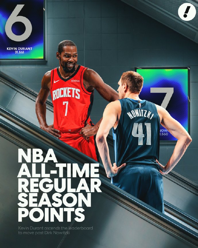 本赛季至今,杜兰特的生涯总得分也已经先后超越了张伯伦和诺维茨基这两位名宿,升至历史第六。不仅如此,杜兰特本赛季还有望超越乔丹,跻身历史前五。