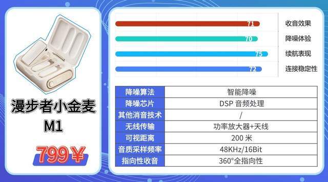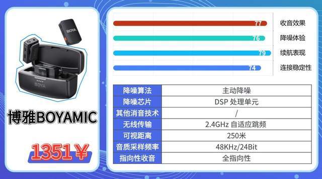 宽频响范围可捕捉更多声音细节,音质优于同价位入门款产品;全指向拾音单元覆盖范围广,室内外收声都很清晰。50米内信号传输稳定,适合多人拍摄场景。智能降噪对基础杂音过滤效果好,户外大风天气需要使用防风罩。没有配备充电仓,发射器单块电池续航7.5小时,长时间拍摄需要携带充电设备。
