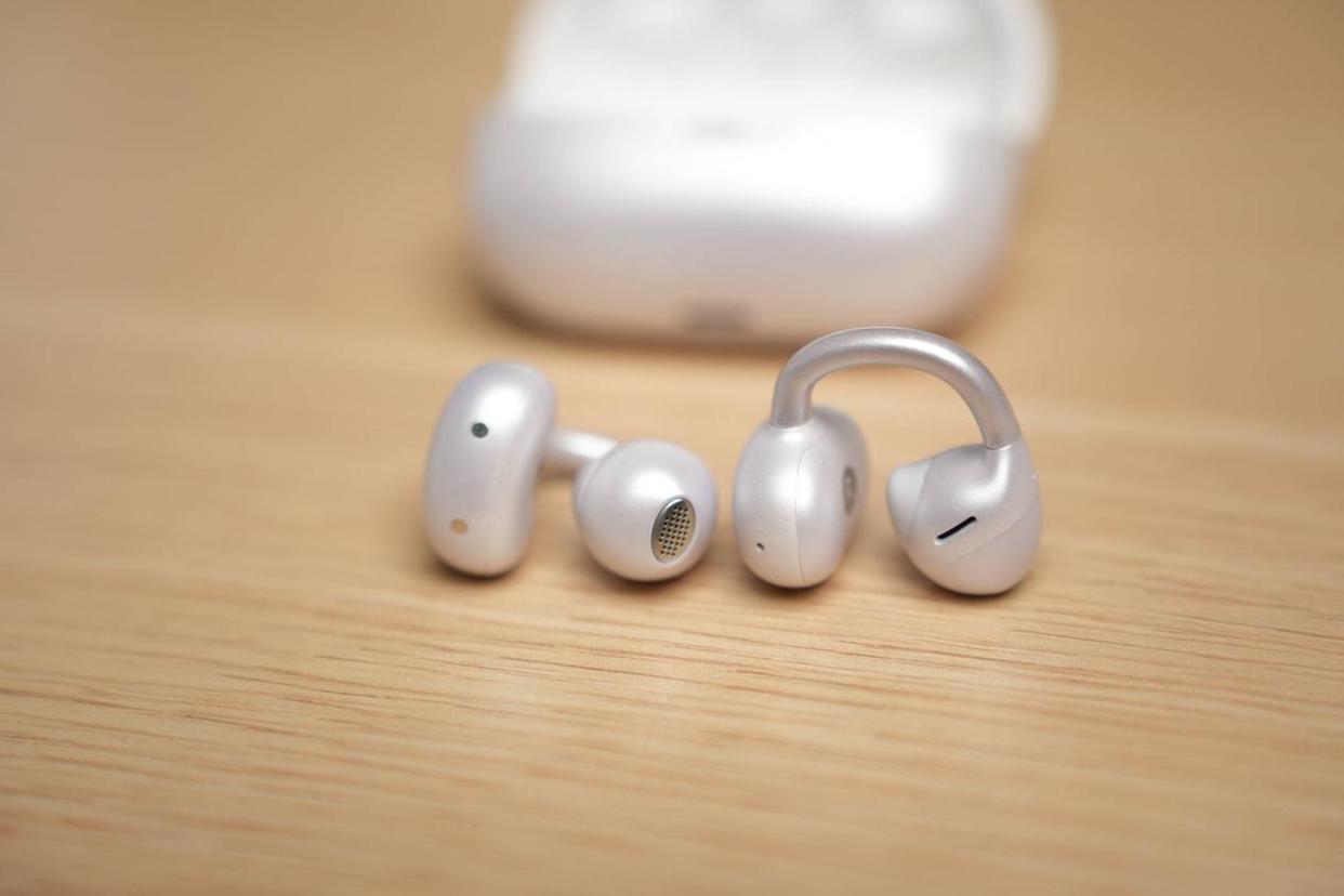 华为FreeClip 2延续了品牌一贯的精致设计,新增丹宁蓝、羽沙白两款配色,搭配织纹质感充电盒,手感细腻,颜值与辨识度都很高。充电盒体积小巧,随身携带毫无压力。单耳约5.1g,升级后的C形桥结构结合记忆金属与“舒适豆”设计,对多数耳型适配不错,通勤佩戴稳定性良好。不过耳廓偏大的用户长时间佩戴可能会有轻微夹耳感,大幅度运动时偶尔会有滑落风险。