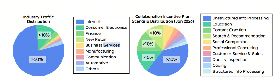 左边的饼状图显示了行业流量分布,互联网占据了主导地位。右边的饼状图显示了企业客户使用场景的分布,其中非结构化信息处理、教育、内容创作和搜索推荐是当前主要需求场景。