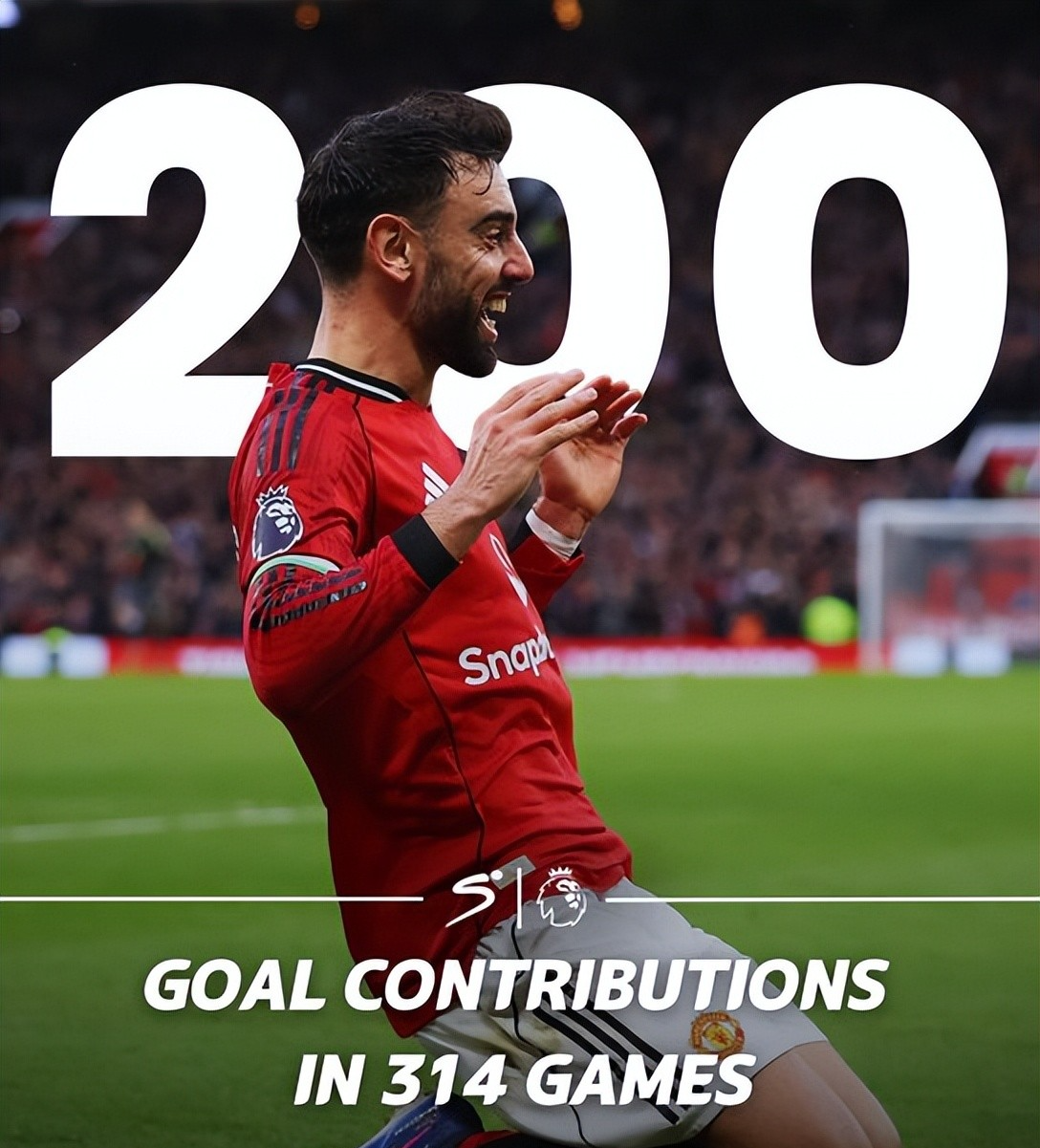 而在314次出场就完成104粒进球和96次助攻的B费,同样也在对阵热刺的赛后完成了曼联生涯制造200球的里程碑。